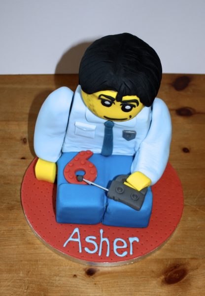 Asher is mad on Lego and wanted a Lego Policeman birthday cake this year. “No problem” I said. Anything for the other man in my life. I thought. And then he gave me his little Lego policeman and I had to make it! What was I thinking? I was completely stumped. How was I going to get the proportions right? How would I make him stand up without falling over? There were endless questions and not all of them were answered.
