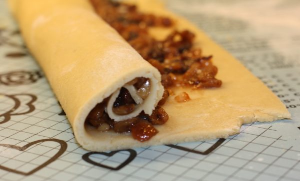 Spread the mince meat over the pasty. Avoid going too near the edges as it will spill out whilst baking. I cut the dough into a neat square to make it more even to cut.