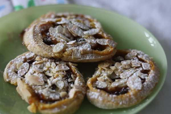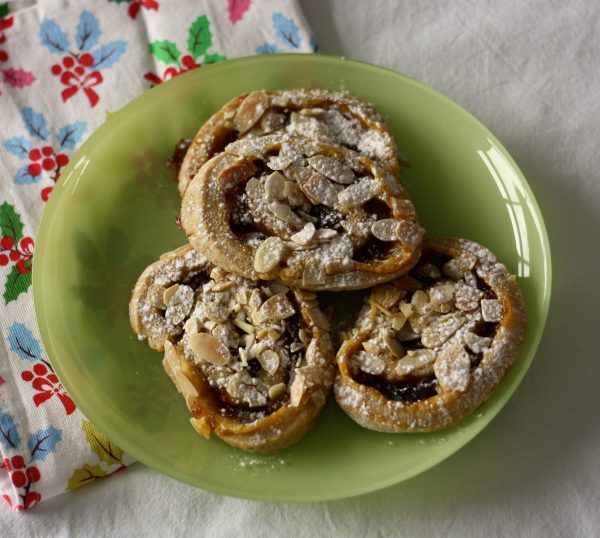 For a modern twist on a mince pie these swirls are easy to make. What’s more you can assemble and freeze them ready to bake straight from the freezer on Christmas day. They taste best when warm from the oven with a dollop of cream. I’ve made them 5 times so far – testing the best combinations/ types of mincemeat & pastry / how thick the marzipan should be etc and I think I’ve really nailed it. My sister tried them and siad “they were the best thing I had made in a long time” I’m not sure if that means they taste really good or everything else I have made recently hasn’t tasted good! I’m going with the deeelish option!