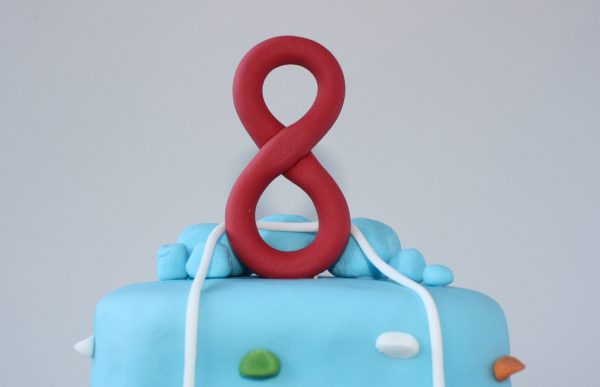 I decided to make the ‘8’ to sit on the top at the last minute. To make sure it was hard I mixed the red sugarpaste with some Tylo powder, rolled it out and shaped the number then pushed a cocktail stick diagonally into it. I then placed it in the oven at 50ºC for 10 minutes. I removed it, let it cool completely then repeated. On the second cool it was firm. I left it over night to give it an extra chance to harden then stuck it in the cake the next morning with a little royal icing for good measure and had a few blue rocks around it for effect. This worked really well but the red colour did darken a little.
