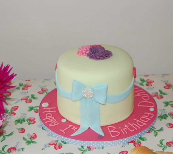 As you can see the cake board was a strong pink colour and was dotted with more buttons made from sugarpaste and it was finished off with a cute spot ribbon. Jane Means ribbons are my favorite. They’re the best around and she has such a great selection.