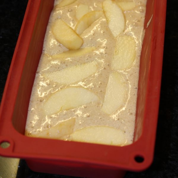 Cut the apple into small chunks and drop them into the cake mix. They will sink to the bottom and make the cake very moist so don’t add more than one layer of apple.