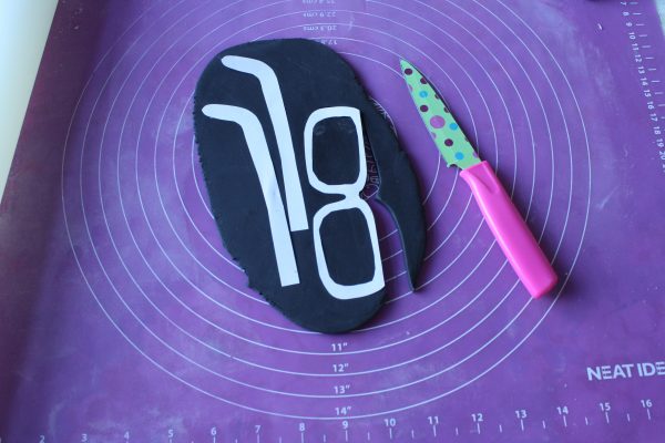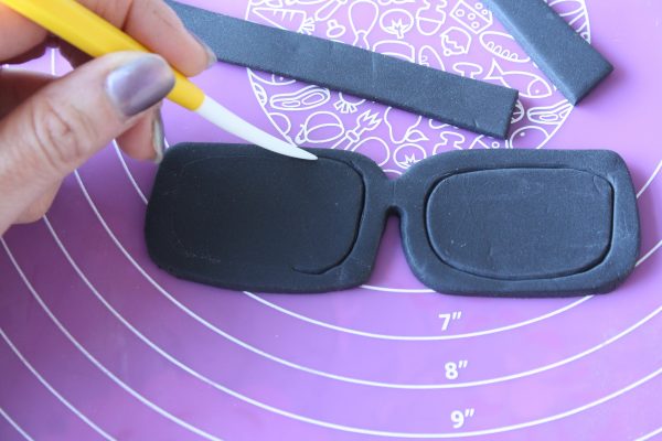 First I kneaded a little Tylo Powder into the black sugar paste. This makes it into a modelling paste so it will get harder quicker. I drew a template of sunglasses and then rolled out the sugar paste. I then carefully cut out around the shape. I used a sharp knife to do this and then marked the outline with a pointed tool. Then I cut out the arms of the sunglasses and placed all the pieces onto a piece of kitchen paper and left it to harden up over night but leaving it for 24 hours is better.