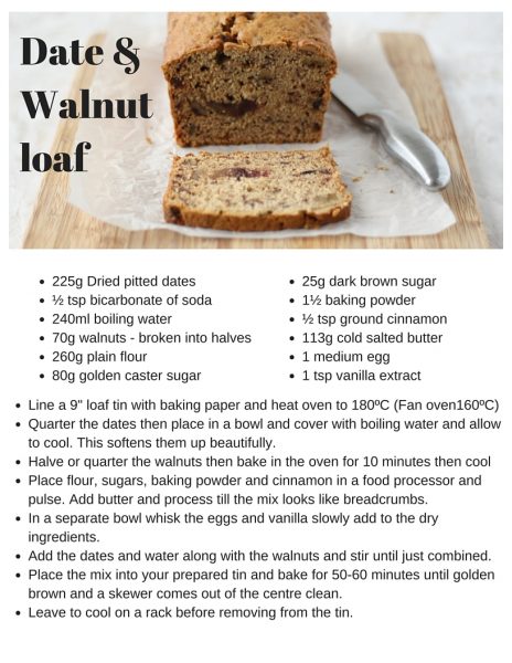 Sometimes you need a little afternoon pick me up and for me this is it. A slice of date and walnut loaf tastes great on its own but with a little butter spread across it – deeeelishhh!. Oooooh butter! One of life’s little luxuries! The reason I like this loaf so much is because it has a really firm texture. One slice is often enough – who am I kidding one slice is never enough! I wish I could pack it into packed lunches but the whole nut allergy at school thing prevents me so we’ll just have to stick to eating it here at home. (smiles as she types!)